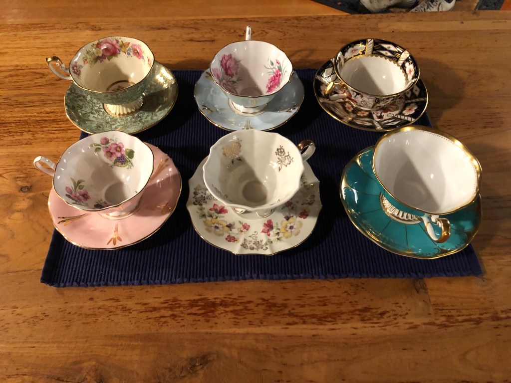 In the gift department, I made out like a bandit. I received a particularly lovely gift from my parents. The picture below is of a set of teacups and saucers that I have admired since I was 5 years old. This set has always lived on a shelf in a glass cabinet in my parents’ house. When I was young – and under supervision – I could look at them and hold them carefully and they always made me dream of royalty and elegant events and beauty beyond compare. I picked up a package yesterday from the Mendocino post office and what should be inside it but…