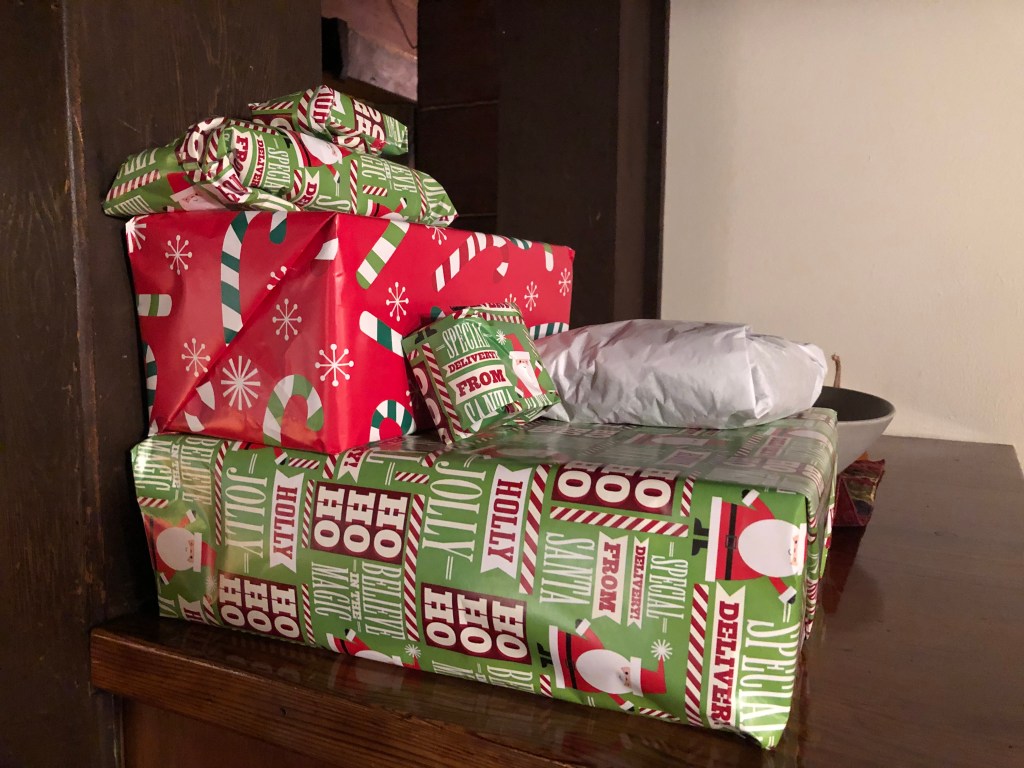 My 50th also precipitated a shopping spree with my daughter. We headed to downtown Mendocino and boosted the local economy with frequent recitations of “You only turn 50 once!” True! And such a useful mantra when you’re shopping for your your 50th, it turns out. Here is the stack of gifts, so nicely wrapped by my daughter in Christmas paper, which is the only type we had to hand.