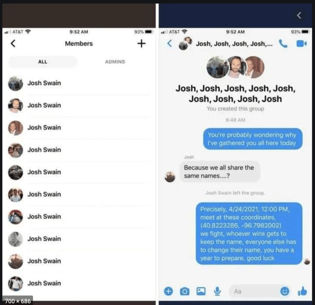 Well – as those of you who are au courant already know, the Josh fight was a pool noodle battle extravaganza organized by one Josh Swain to be held in Nebraska among people whose first name was Josh. Here is a screenshot of the screenshot (repeat many times) of the text thread that kicked this off: