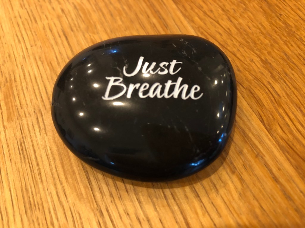 For today, three photos to share with you – one of the campus this morning in the fog, one of a rock given to me by Suzi Weersing (helpful message right now!) and one of a pollinator hard at work that I saw while walking the dog. The native lilacs are blooming, which is such a nice time here.